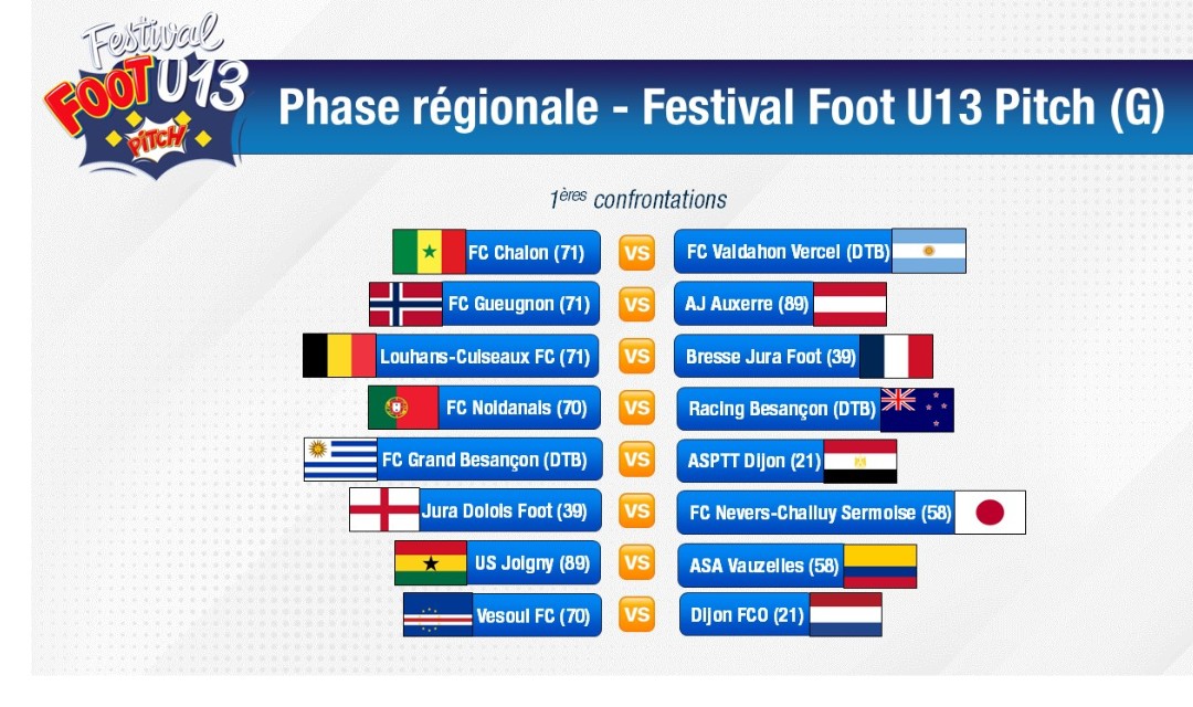 A l’occasion du tirage au sort du 9 avril dernier organisé chez notre partenaire Intersport, la Ligue Bourgogne-Franche-Comté de Football vous présente désormais les nations attribuées aux 32 équipes qui seront présentes ainsi que les premières confrontations de la phase régionale du Festival Foot U13 PITCH, organisé le dimanche 3 mai 2026 lors  à l’Astragale, !
